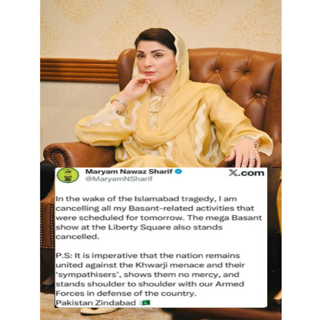 Punjab Chief Minister Maryam Nawaz on Friday announced the cancellation of all her Basant-related activities scheduled for Saturday, including the highly anticipated mega Basant show at Liberty Square in Lahore, following a devastating suicide bombing in Islamabad that claimed at least 31 lives.