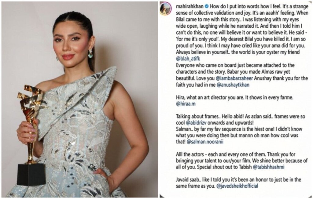 In her note, Mahira gave special thanks to stylist Babar Zaheer, manager Anushay Khan, art director Hira M Saad, cinematographer Abid Rizvi, and co-star Javed Sheikh. She reserved her final words for producer and co-star Fahad Mustafa, praising his courage and generosity in making the film happen.